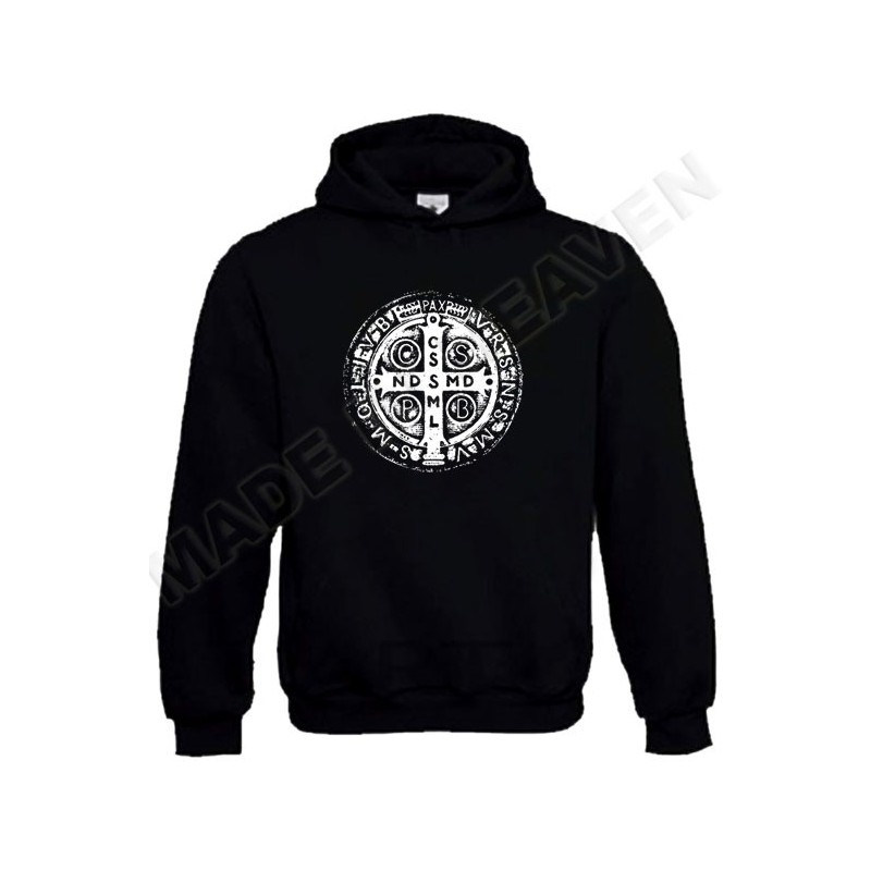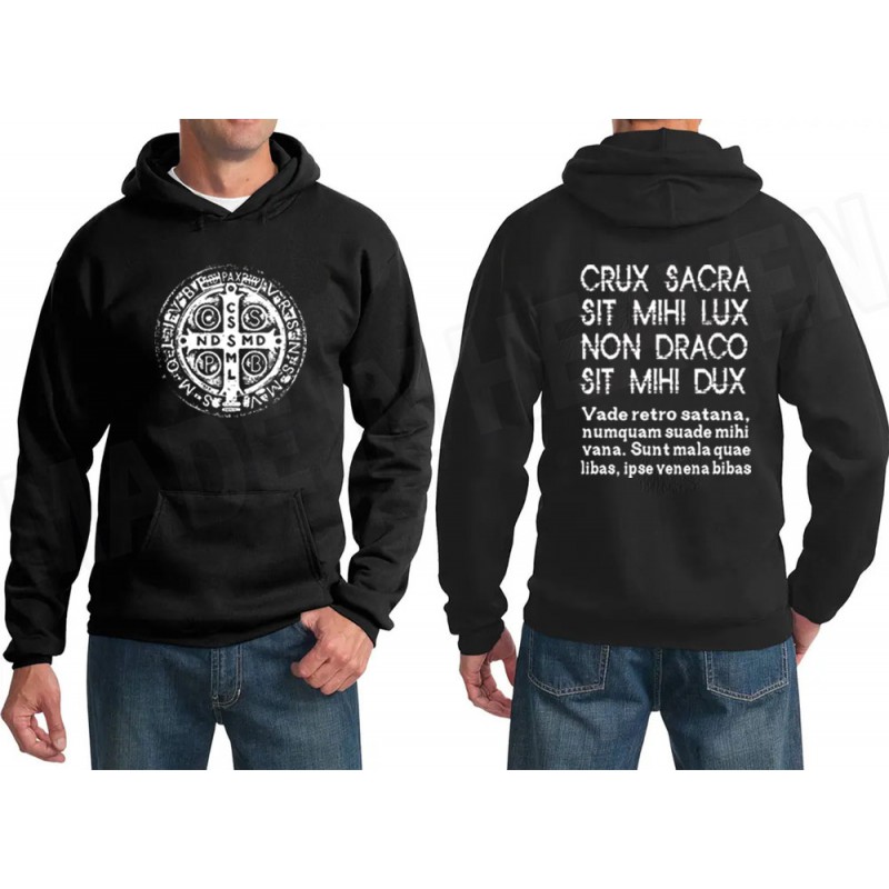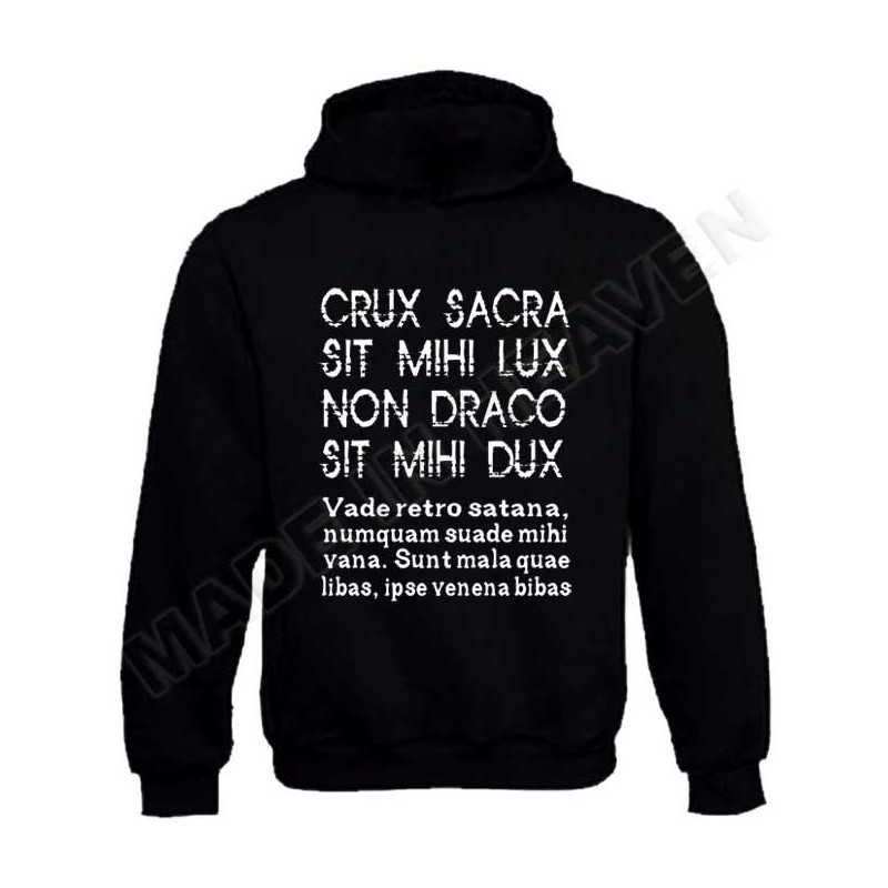 Na belce pionowej krzyża, od góry do dołu: C S S M L- Crux Sacra Sit Mihi Lux (Krzyż święty niech mi będzie światłem). Na belce poprzecznej: N D S M D- Non Draco Sit Mihi Dux (Diabeł -dosłownie: smok- niech nie będzie mi przewodnikiem).